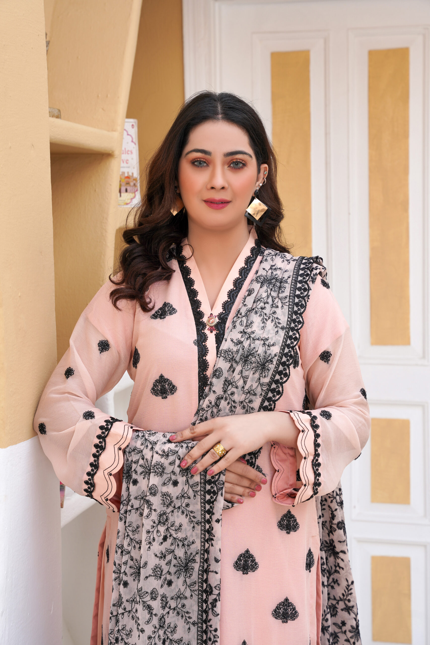 Crafted on premium bamber chiffon fabric, this exquisite ensemble showcases: