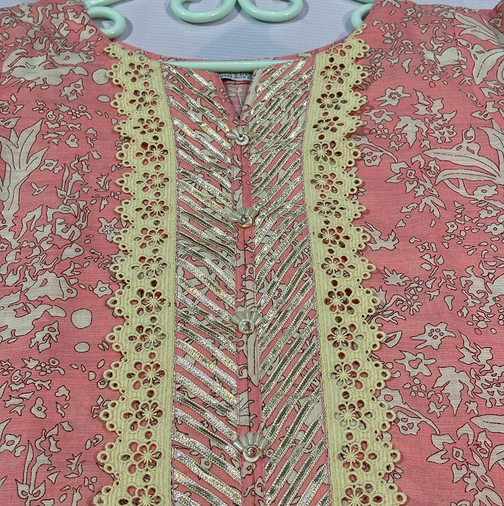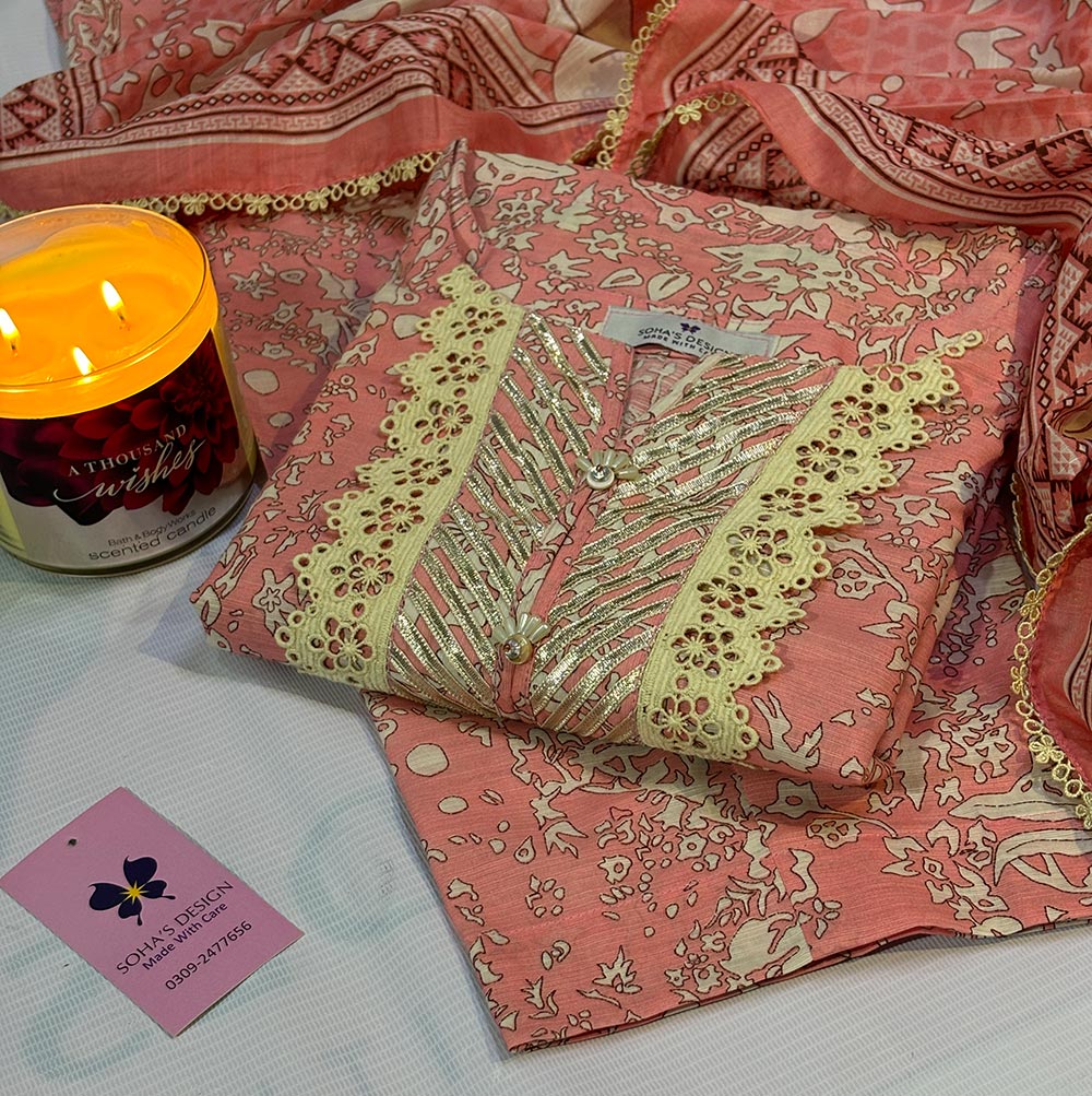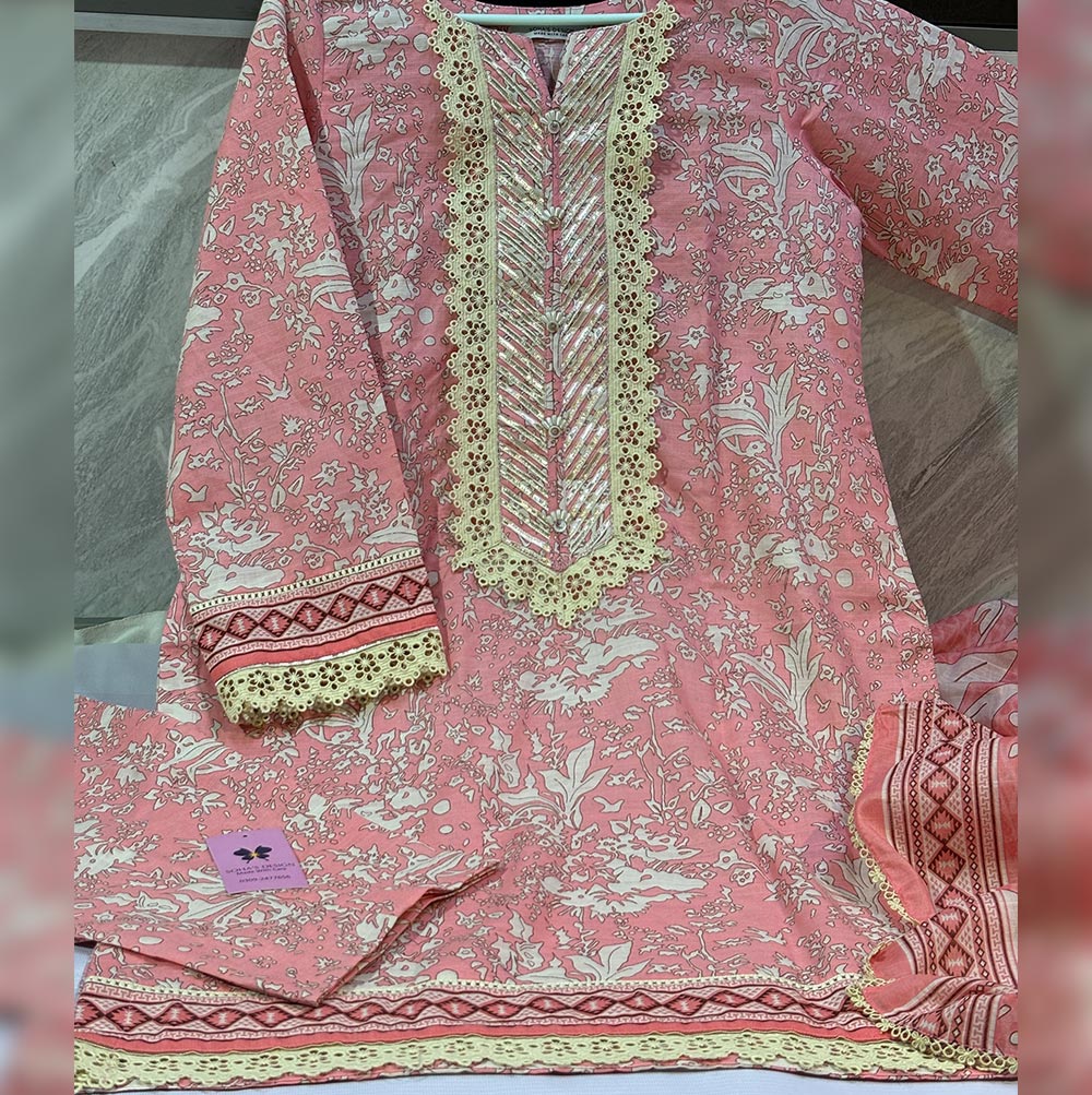 Effortlessly beautiful doria lawn 3 piece intricate neckline designed with luxurious scalloped lacing,traditional dhanak work,neck slit detailing hand embellished pearl flower,dupatta pret wear four side quroshia lacings paired with straight trouser a complete blend of luxury and comfort.