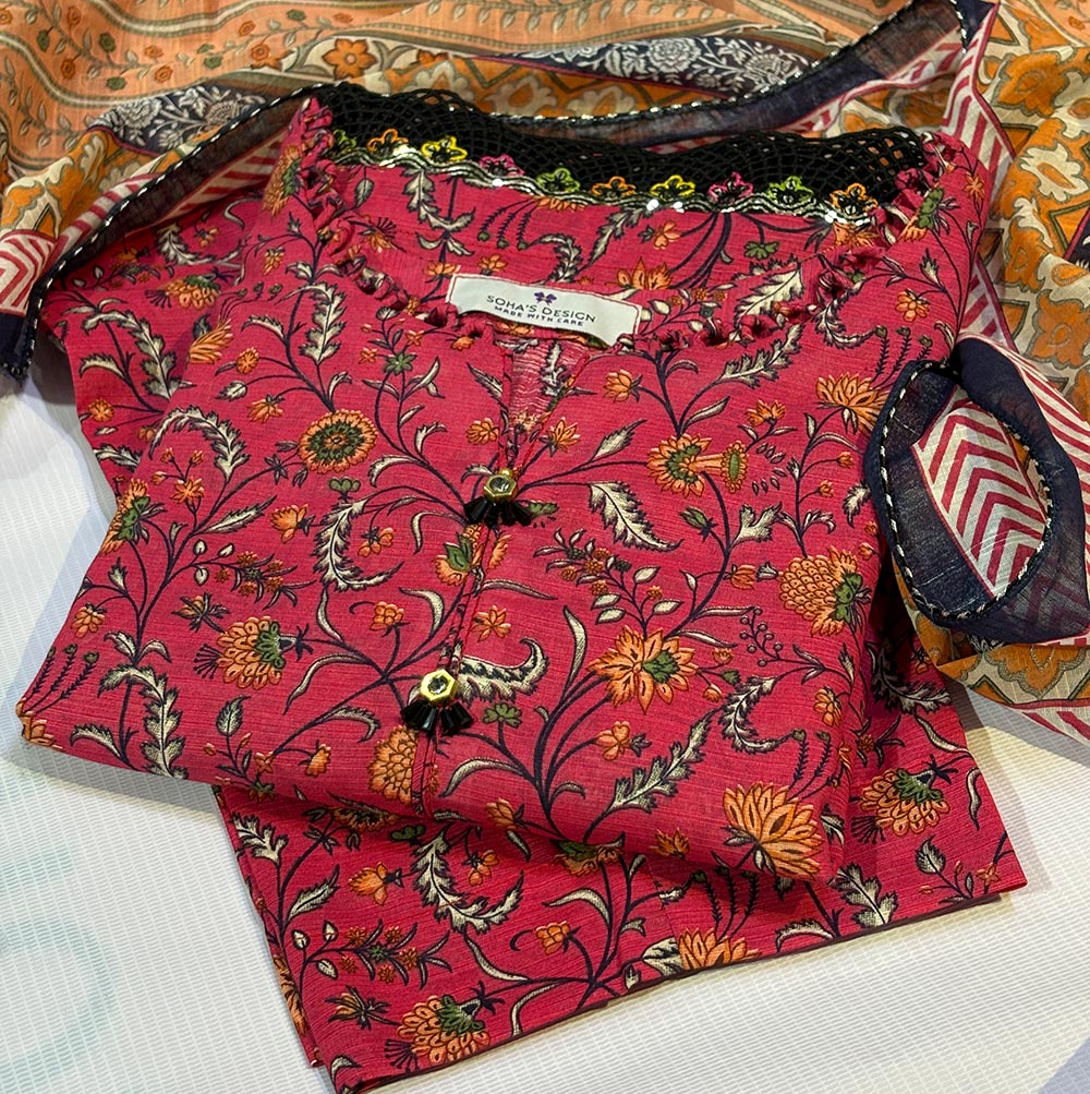 Introducing Soha’s Doria Lawn 3-Piece Set: Elevate your wardrobe with Soha’s exquisite Doria Lawn 3-piece set, perfect for gatherings and festive occasions. This design features intricately crafted detailing, including a creatively looped neckline and beautifully hand-made floral accents on neck slit. The addition of vertical stripes on sleeves ,Daman and enchanting black quroshia lacing enhances its sophisticated appeal. Experience effortless chic with this stunning ensemble that combines style and affordability.